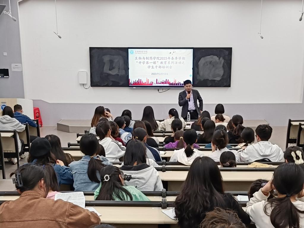 为进一步加强学生干部队伍建设,提高学生干部的综合素质和工作能力,生物与制药学院于我校东校区物理阶梯教室召开2023年春季学期“开学第一课”教育系列活动之学生干部培训会。该院党委副书记兼副院长蒋德旗、全体辅导员及学生干部参加了此次会议。