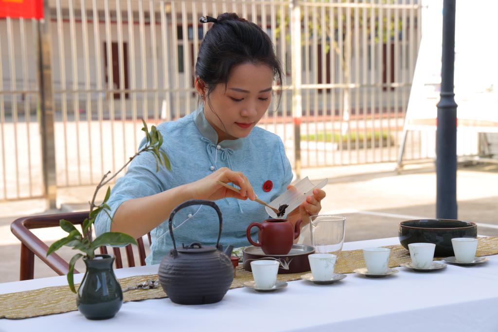 活动中,2023年家庭经济困难学生能力提升茶艺培训班的学员为参加活动的师生现场表演直口玻璃杯和盖碗茶艺,随后,园和茶庄企业茶艺师展示紫砂壶茶艺。现场茶艺师和准茶艺师们精湛的技巧,娴熟的手法,吸引众多师生驻足观赏,品尝各种不同的茶汤。