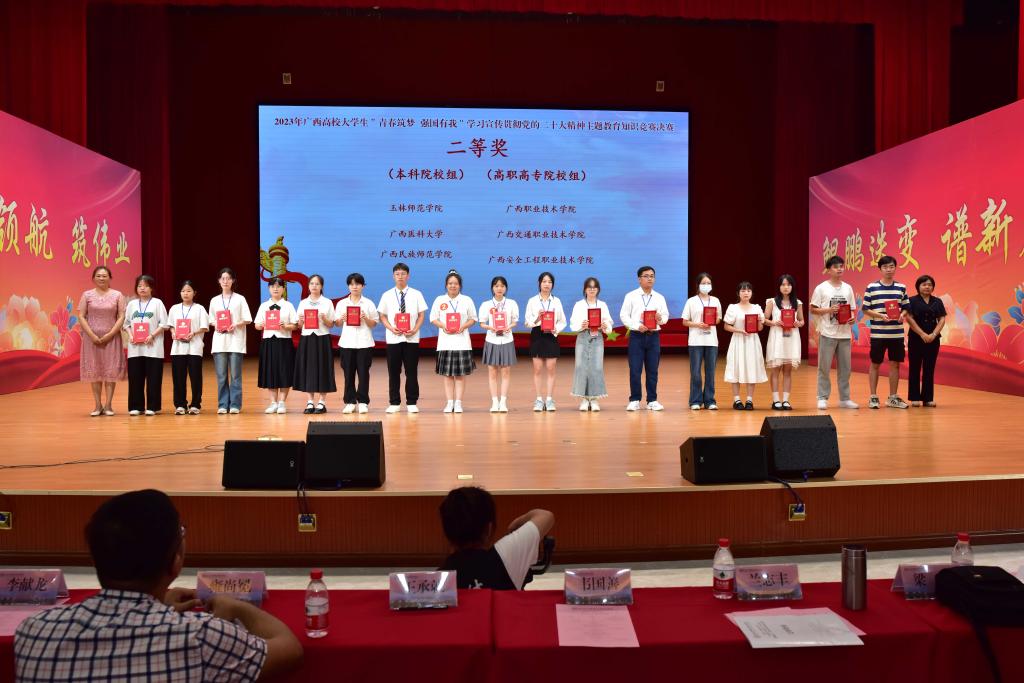 近日,2023年广西高校大学生“青春筑梦 强国有我”学习宣传贯彻党的二十大精神主题教育知识竞赛决赛在崇左幼儿师范高等专科完美在线登录官网举行。我校代表队钟进清、覃美琼、罗春月同学荣获二等奖。完美在线登录官网获优秀组织单位,领队老师梁莉冰获优秀指导奖。