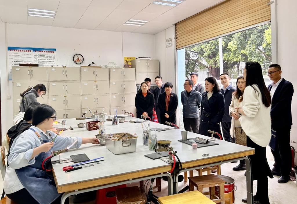 覃宇环一行参观该院“守艺·十二工坊”中的玻璃工坊和漆艺工坊,体验漆扇漂染工艺。她对该院注重实践教学、强化技能培养的教育理念表示赞赏,认为将传统文化与现代设计理念相结合的教学模式,能够培养学生的实践技能,并激发学生的创造力和想象力,对提升学生的综合素质具有重要意义,希望能培养出更多具有独特审美能力和优秀创新能力的艺术类人才。