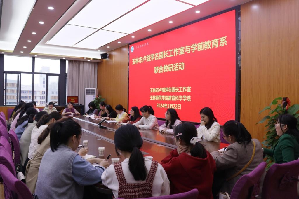 3月22日下午,教育科学学院于我校东校区明德楼学院会议室与玉林市卢剑萍名园长工作室开展联合教研活动。该院副院长杨振芳,玉州区机关直属机关第一幼儿园园长卢剑萍以及双方教师代表到场参加本次联合教研活动。