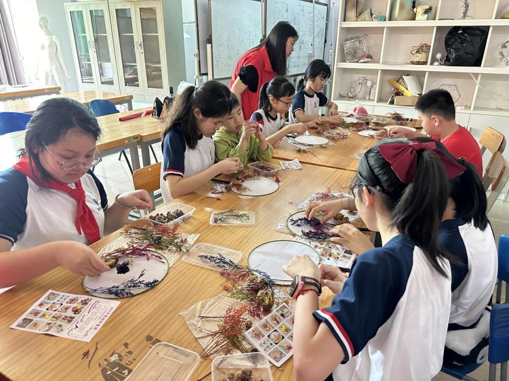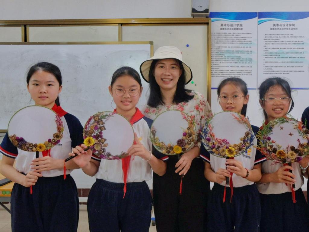 活动现场,该院教师对干花团扇的发展历史、材质、形状、用途等方面进行充分地讲解,详细介绍本次团扇活动所用到的工具材料,鼓励少先队员们发挥奇思妙想,用一花、一叶、一妙手创作出兼具观赏性和实用性的团扇作品。随后,教师和大学生志愿者向少先队员们发放空白扇子、永生干花和各种辅料工具,从构图到粘贴制作,少先队员们在教师和大学生志愿者的指导下,有条不紊的进行选材、设计造型、色彩搭配、粘贴干花等,现场气氛十分活跃。经过努力,干花、绿叶在团扇上展现出独特的风采,原本空空如也的团扇瞬间花团锦簇。
