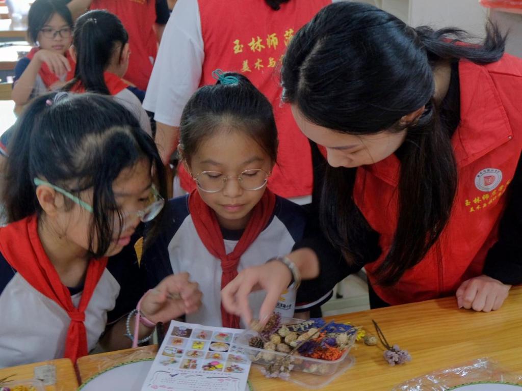 为推进少先队员美育教育的全面发展,提高少先队员们健康的审美观念、审美情趣和审美能力,3月31日上午,美术与设计学院“蒲公英”美育工作室于我校东校区综合实训中心开展玉林市红领巾校外实践基地美育浸润行动玉东新区实验小学专场活动。该院党委书记黄培英、党委副书记周美艳、辅导员及教师代表,玉林市玉州区玉东新区实验小学1801班师生代表30余人参加此次活动。