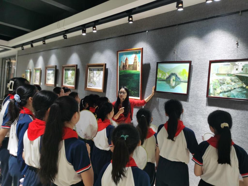 最后,该院教师带领少先队员们参观2022级美术学专业《风景写生》课程汇报展,教师以有趣且通熟易懂的语言讲解每一幅作品的主题和内涵,激发少先队员们对艺术的热情,加深对画面构图和色彩表现的认识,大大提升少先队员们审美情趣和艺术素养。