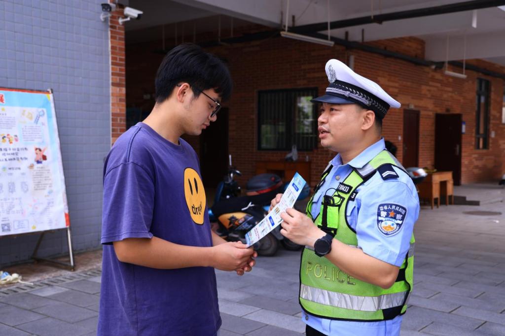 讲座上,玉林市公安局交警支队成员黄广凤通过理论教学和事例展示相结合的方式,运用多起未遵循交通安全规则造成的事故案例向学生讲解头盔的正确佩戴方式,教育引导学生拒绝酒醉驾、无证驾驶、超速行驶等交通违法行为,增强学生的交通安全意识和交通安全避险能力。讲座结束后,交警和志愿者通过发放传单和知识讲解的形式向在校学生普及交通安全知识,增强学生交通法治观念,营造浓厚的交通安全宣传氛围,为构建安全、和谐的校园环境奠定坚实基础。