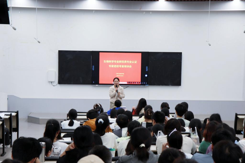 4月9日下午,生物与制药学院于我校东校区格物楼物理阶梯教室召开生物科学师范类专业认证专家进校考查全体学生培训会。生物科学专业全体学生参加会议,培训会由该院党委副书记兼副院长张琴主讲。