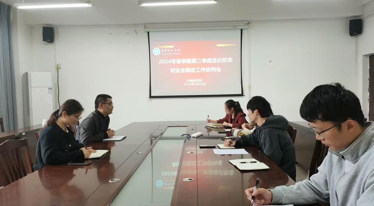 4月10日,外国语学院于东校区厚德楼1-306会议室召开2024年春季期第二季度意识形态和安全稳定工作研判会,该院党委书记靳闯,党委副书记梁丁丁以及全体辅导员参加会议。