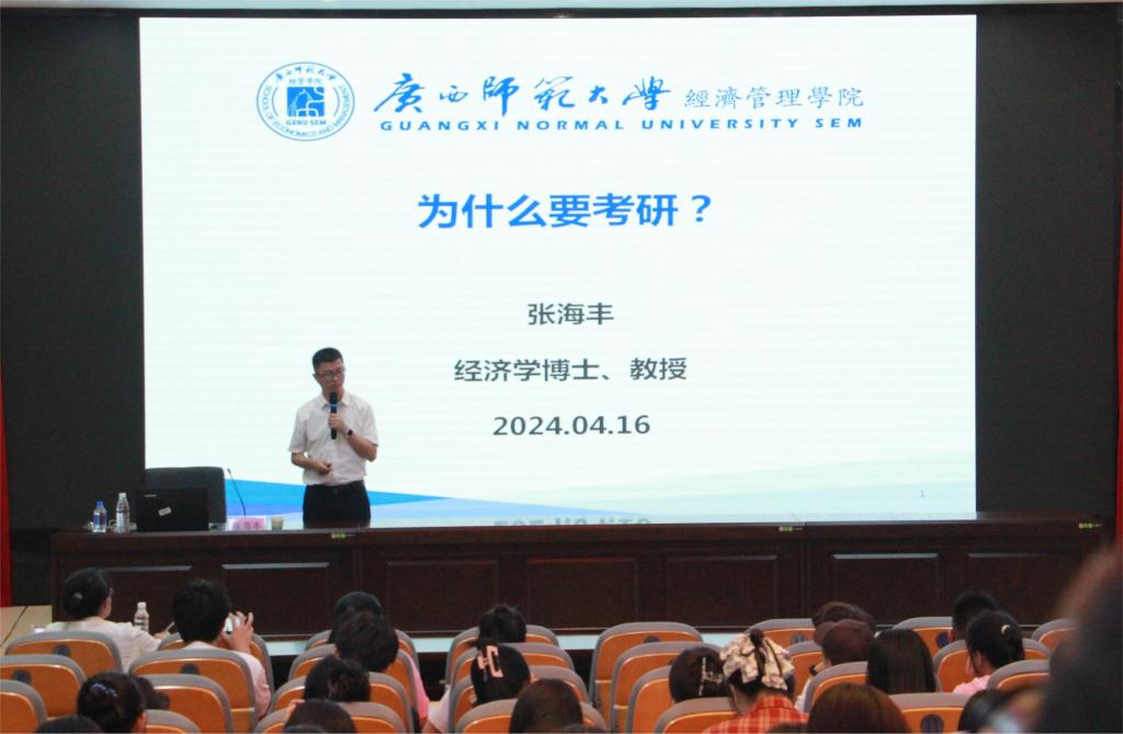 4月16日晚,张海丰教授为该院师生举办一场题《为什么要考研?》的考研指导讲座,张教授就当前的考研形势、经济管理类专业学生考研选择、广西师范大学经济管理学院培养特色等方面进行分享,现场解答学生们关于学硕与专硕的区别、复试试题技巧解答、近几年岗位的录取分数线等问题,内容具体,数据翔实,现场气氛活跃。