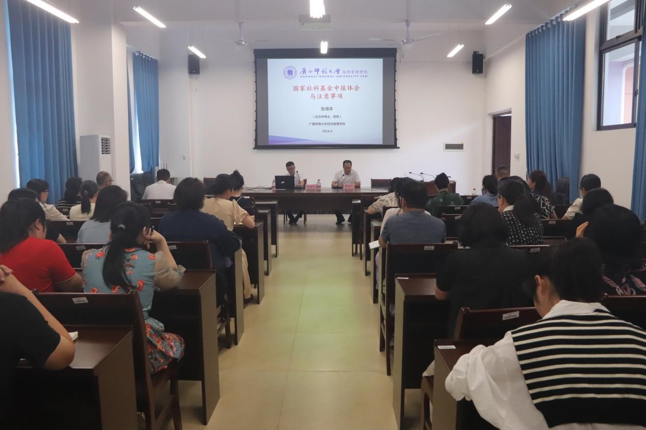 4月16日下午,商学院特邀广西师范大学经济管理学院院长张海丰教授,于我校东校区清源楼A-217会议室为该院教师带来一场题为“国家社科基金申报体会和注意事项”的高质量讲座。讲座由该院党委书记管金标主持,该院全体教职工到场聆听。