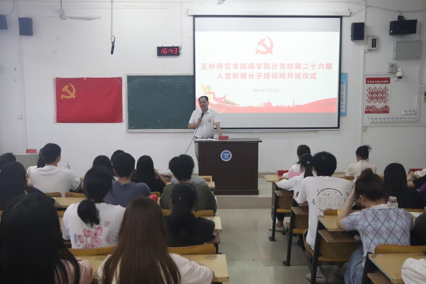 为深入学习贯彻习近平新时代中国特色社会主义思想,切实做好入党积极分子教育培养工作,4月18日下午,商学院分党校于我校东校区博学楼1-102教室举行第二十六期入党积极分子培训班开班典礼。该院党委书记兼党校校长管金标、党委专职组织员谭荔、副书记赵伯妮、专职组织员、各学生党支部书记及第二十六期全体入党积极分子参加本次开班典礼。典礼由滕广伟主持。