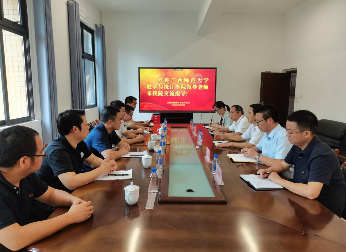 4月18日下午,广西师范大学数学与统计学院党委书记陆锋、院长张映辉一行到我校数学与统计学院进行对口共建交流指导,并于我校东校区新民楼C315会议室召开座谈会,该院党委书记庞伟、院长王培等全体领导班子成员接待。