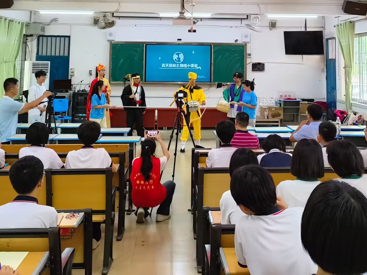 活动中,巫钊院长围绕科技与生活主题,向现场师生科普物理在人工智能、航空航天、工程材料等领域的应用。随后,学生党员志愿者们借助古典名著《西游记》西天取经故事,向师生们介绍物态变化、马德保半球实验等物理实验,通过情景剧表演巧妙将物理知识与故事内容深度融合,激发同学们对物理学习的好奇心和兴趣,点燃他们的科技梦想。