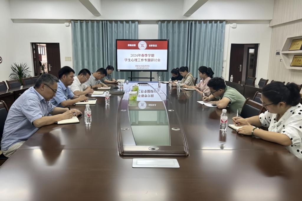 为进一步加强心理健康教育工作,提升学生心理健康水平,4月19日下午,历史文化旅游学院在我校东校区至善楼509会议室召开2024年春季学期学生心理工作专题研讨会。会议由该院党委副书记严耀燕主持,该院领导班子成员、院长助理以及班主任代表参加会议。