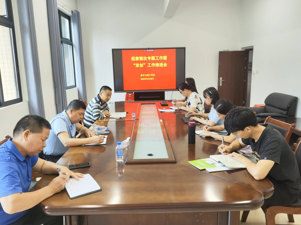 4月29日,数学与统计学院于我校东校区新民楼C315会议室召开巡察整改专题工作暨“双创”工作推进会,该院党委书记庞伟、党委副书记李秀英、党委专职组织员陆发焕、钟开运及全体党支部书记参加会议。会议由庞伟主持。