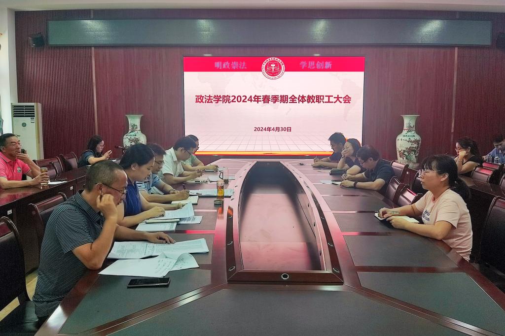 4月30日下午,政法学院于我校东校区明德楼508会议室召开2024年春季期全体教职工大会。该院党委书记陈一栋,院长周伟萌,党委副书记黄燕纳,副院长姚靖、朱顺以及全体教职工参加此次会议,会议由周伟萌主持。