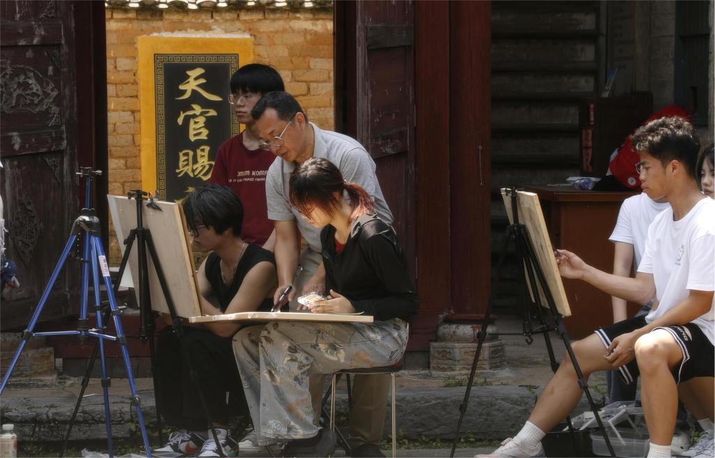 张中带领教师团队、学生先后走访高山村祠堂、高山村小学、高山村古戏台、古火砖巷道等地。他在调研中指出,一是从隐喻认知角度看,高山村缩着深厚的明清民居民俗文化底蕴。用钢笔画的形式是记录高山生活的有效媒介,也是在记录日用生活民居中回馈生活;二是钢笔画形式是理解中国传统建筑设计的有效手段。钢笔画不仅是一种绘画方式,也是一种心性的,创造性的体验过程,只有建立这样具体而又普遍的联系,钢笔画方能守护好民族造物的文脉根基,保护传统工艺的“基因”和“种子”,进而激发出传统工艺的内在生命力;三是钢笔画是发挥以美育人教化作用的标尺。鬱上春华-“画说玉林”系列成果展本质是传承,是维系乡村文化认同感和凝聚力的粘合剂,尤其要从教育层面加以关注,散落在玉林乡村民间的传统工艺是艺术设计的文化基础,是设计教育重要组成部分,无论工艺出新还是设计创新,都不能丢掉我们的传统和生活基础。