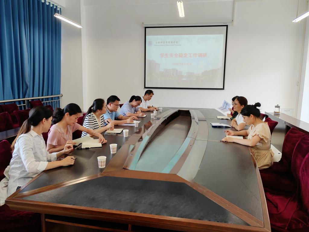 5月21日,学生工作处处长杨潇一行深入商学院开展学生安全稳定工作调研,并召开座谈会。该院党委副书记赵伯妮及全体辅导员参加座谈会。