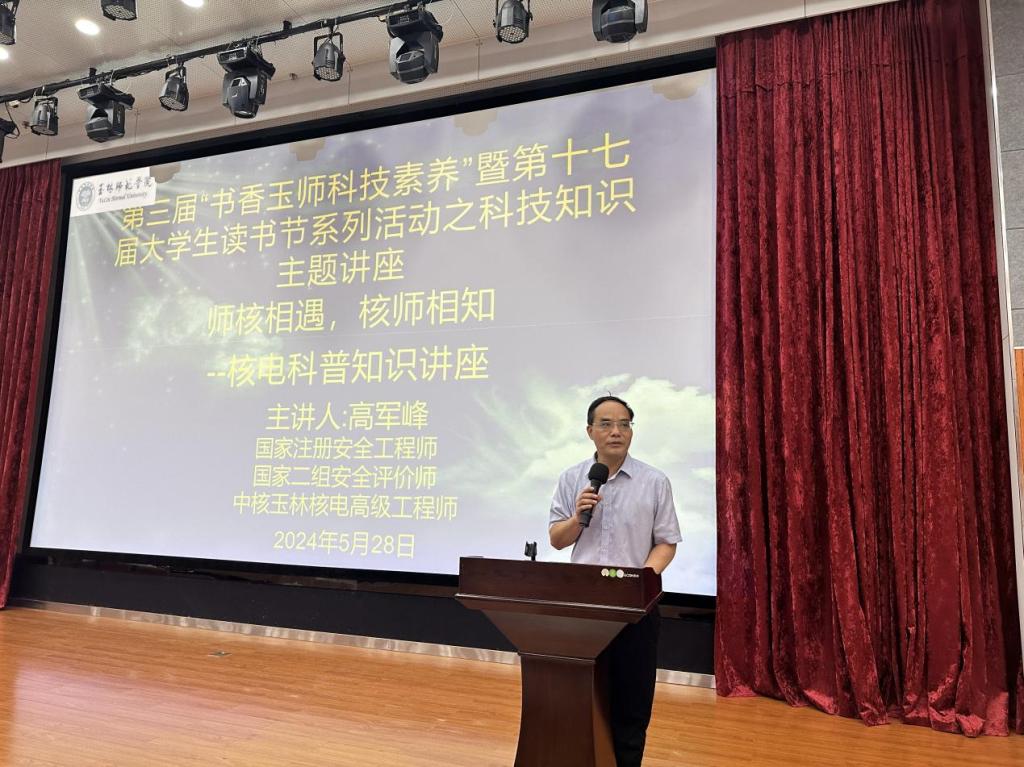 5月28日下午,由图书馆组织主办的“师核相遇,核师相知”--核电科普知识讲座在图书馆一楼视听室举行。讲座由中核玉林核电有限公司办公室主任,拥有丰富的电力企业工作经历的国家注册安全工程师、国家二级安全评价师高军峰主讲,图书馆馆长曾凡贞主持,全校师生320余人听取讲座。
