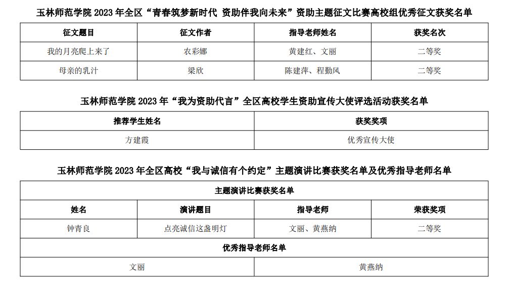 近日,我校在自治区教育厅组织开展的2023年全区高校“学生资助政策宣传月”、学生资助“诚信教育主题月”系列活动中获得佳绩,其中,文学与传媒学院农彩娜、梁欣同学荣获2023年全区“青春筑梦新时代 资助伴我向未来”资助主题征文比赛高校组二等奖;教育科学学院方建霞同学荣获2023年“我为资助代言”全区高校学生资助宣传大使 “优秀宣传大使”称号;历史文化旅游学院钟青良同学荣获2023年全区高校“我与诚信有个约定”主题演讲比赛二等奖;文丽、黄燕纳两位老师荣获“优秀指导老师”称号。