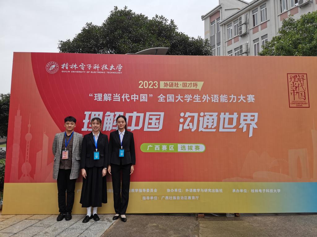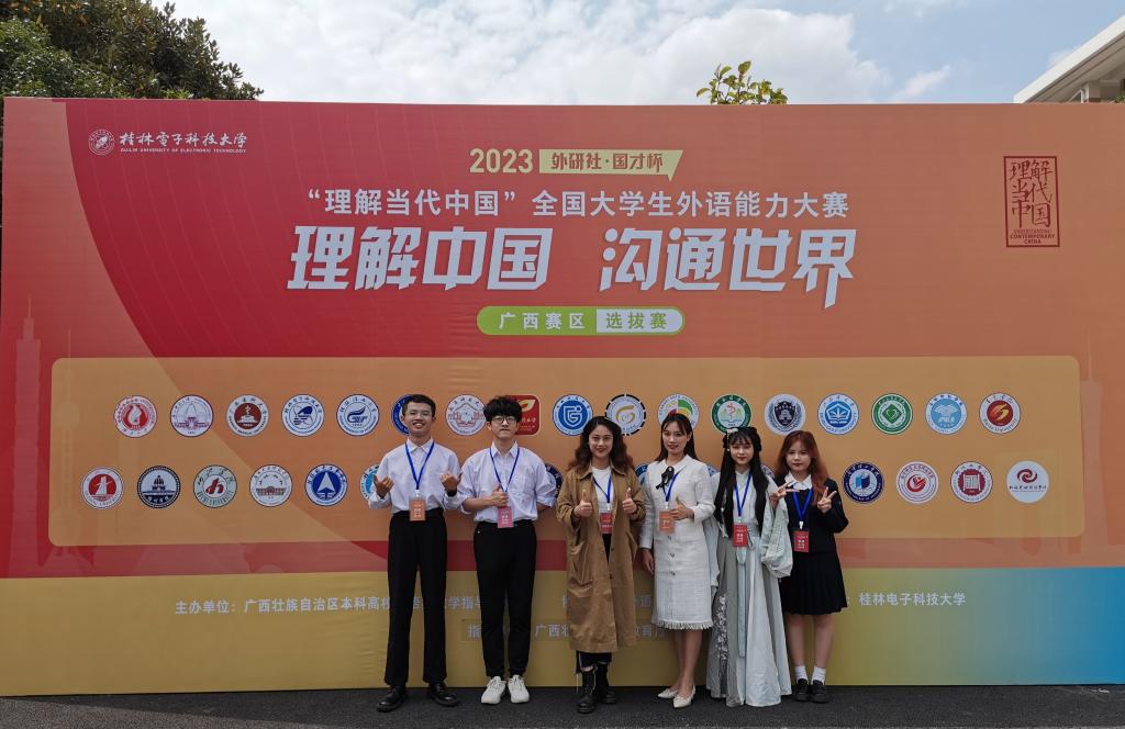 近日,由广西教育厅指导,广西本科高校英语类教学指导委员会主办,外语教学与研究出版社协办的2023“外研社·国才杯”“理解当代中国”全国大学生外语能力大赛广西赛区选拔赛英语组演讲、口译竞赛在桂林电子科技大学圆满落幕。本次广西赛区有来自全区35所高校的研究生、本科生共220人参加,我校经过校赛选拔共派出7位学生参赛。在演讲比赛中,外国语学院2021级英语专业学生梁美珍晋级决赛,获得银奖;2021级英语专业学生李昊、赖芳芳分别获得铜奖。在口译竞赛中,2021级商务英语专业学生郑咏怡获得铜奖。