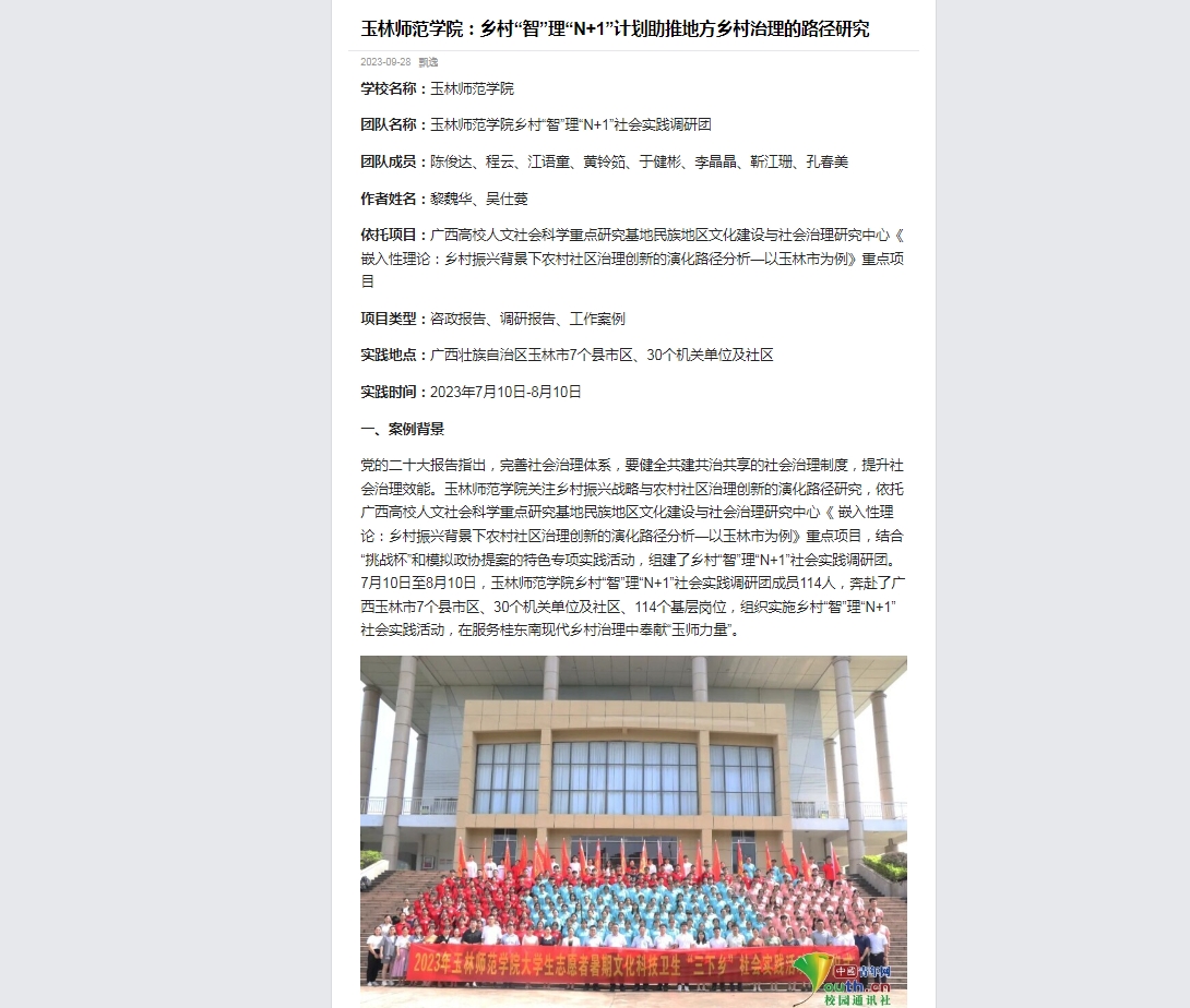 完美在线登录官网着眼于乡村振兴,积极关注乡村振兴战略与农村社区治理创新的演化路径研究,依托广西高校人文社会科学重点研究基地民族地区文化建设与社会治理研究中心《嵌入性理论:乡村振兴背景下农村社区治理创新的演化路径分析—以玉林市为例》重点项目,结合“挑战杯”和模拟政协提案的特色专项实践活动,组建了乡村“智”理“N+1”社会实践调研团。今年7月10日至8月10日,实践调研团成员114人赴了广西玉林市7个县市区、30个机关单位及社区、114个基层岗位,组织实施乡村“智”理“N+1”社会实践活动,在服务桂东南现代乡村治理中奉献“玉师力量”。