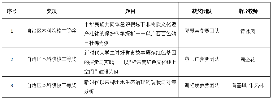 近日,由自治区教育厅主办、广西机电职业技术学院承办的2023年全区高校思想政治理论课研究性学习与实践性教学优秀成果评选活动决赛在南宁举行。我校获得自治区本科院校二等奖1项、三等奖2项。获奖名单如下: