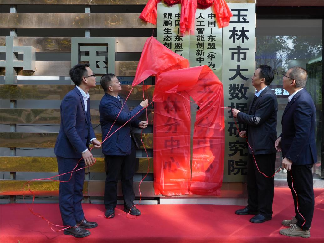 最后,许进杰、吴祖强、陈佐瓒、邹兴共同为中国—东盟信息港鲲鹏生态、中国—东盟(华为)人工智能创新中心玉林分中心揭牌。