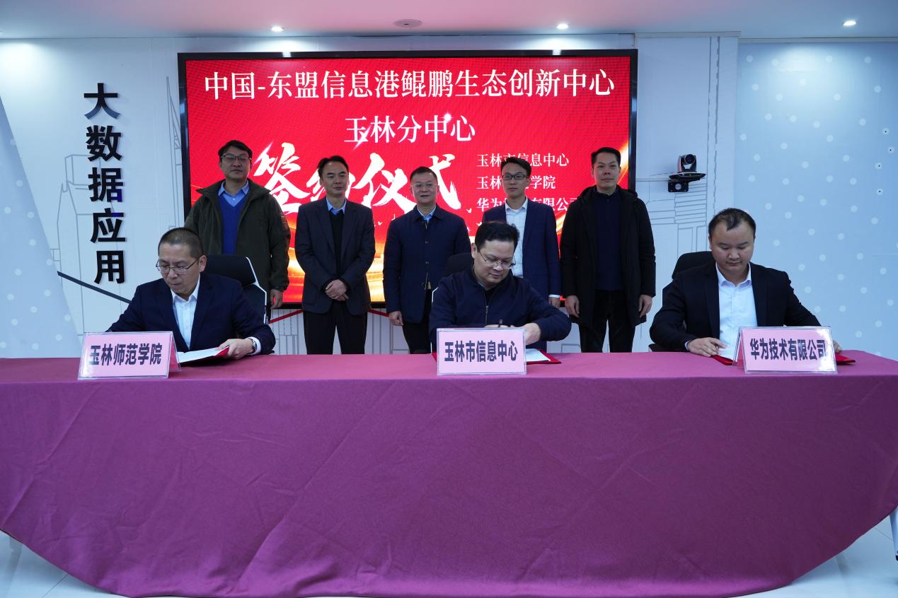 玉林市信息中心、我校、华为技术有限公司有关领导进行签约。