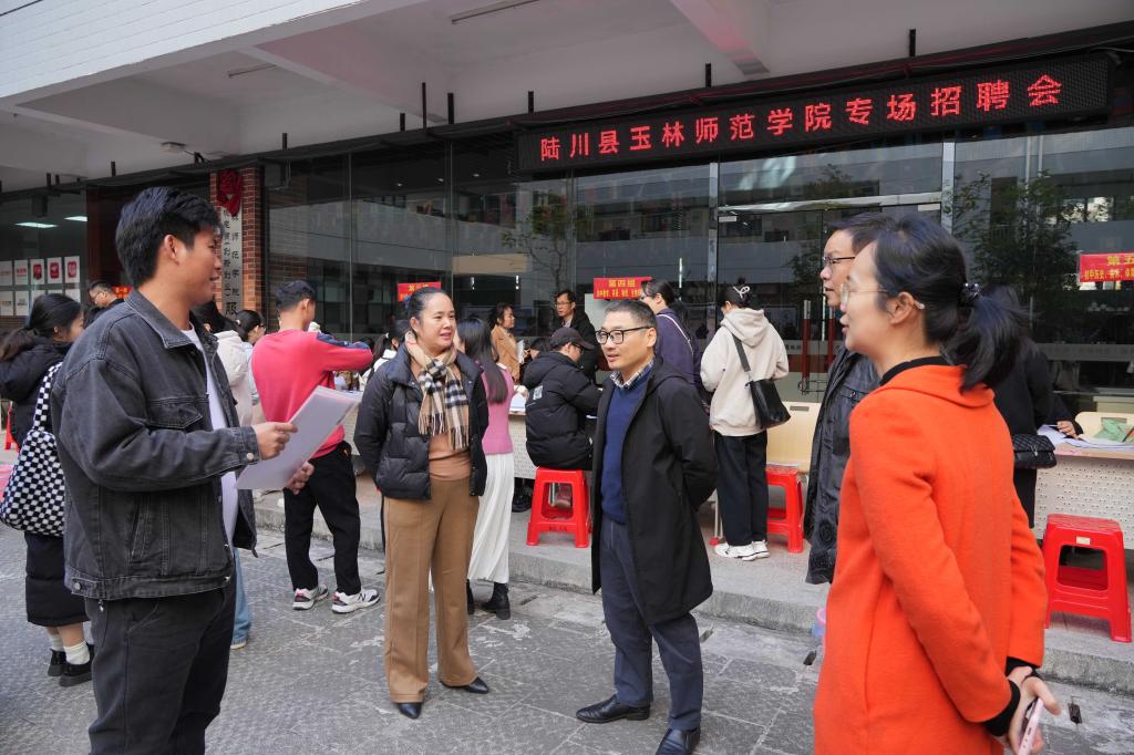 12月28日上午,陆川县完美在线登录官网专场招聘会在我校至善楼举办。我校副校长刘永建带领招生就业处负责人走进招聘会现场了解招聘实况,引导学生们树立正确的就业观,选择“留玉就业”“留桂就业”,积极投身建设新时代中国特色社会主义壮美广西。
