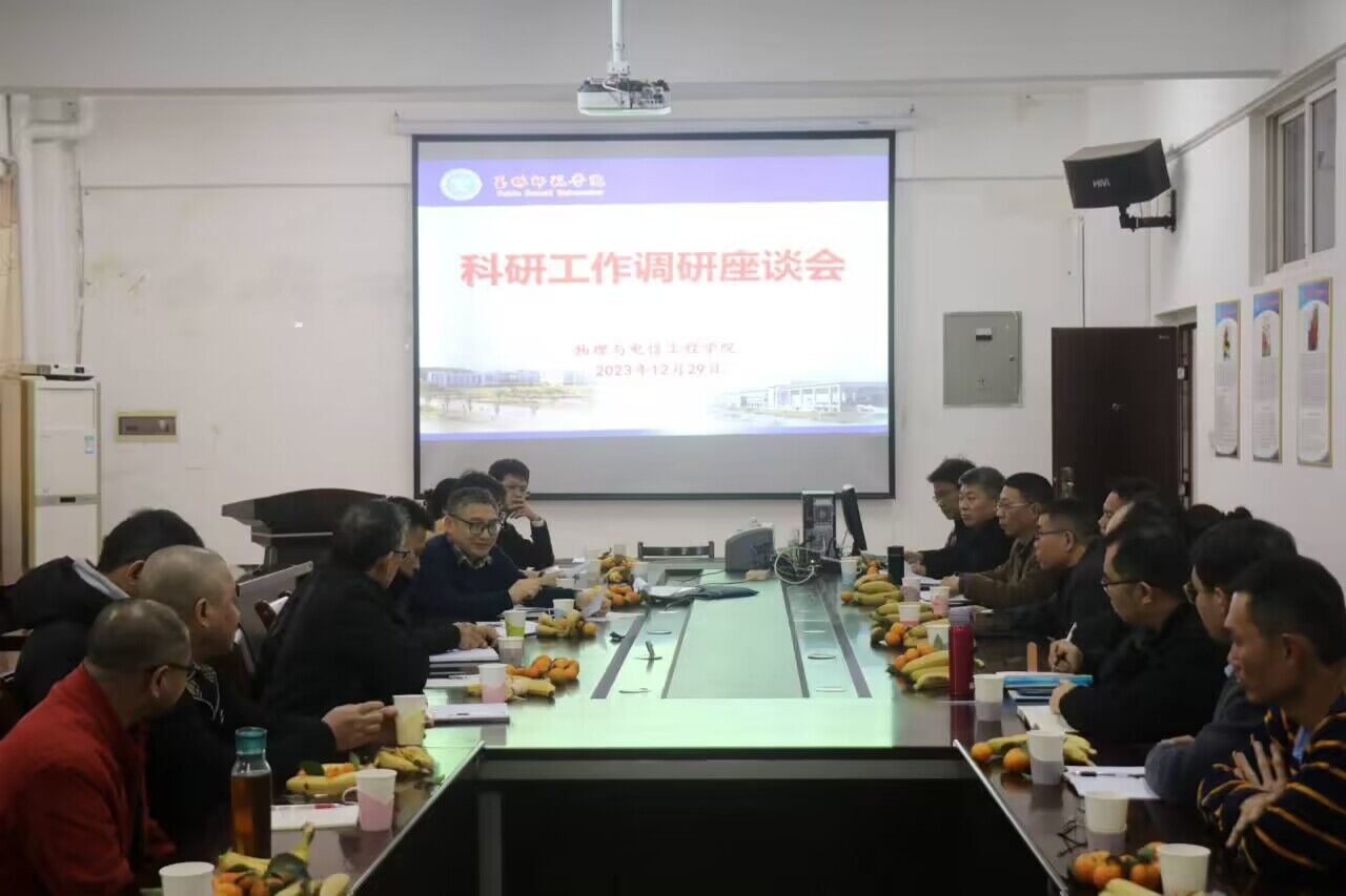 12月29日下午,完美在线登录官网副校长刘永建一行深入物理与电信工程学院主持召开科研工作调研座谈会。科研处相关负责人,物理与电信工程学院相关负责人、教授、博士共同参加会议。