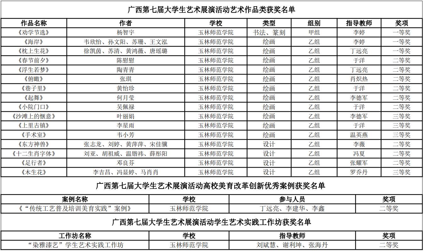 近期,广西第七届大学生艺术展演活动评选结果公布,美术与设计学院师生斩获佳绩,其中艺术作品类一等奖3件、二等奖9件、三等奖4件;高校美育改革创新优秀案例二等奖1篇;学生艺术实践工作坊类二等奖1个。