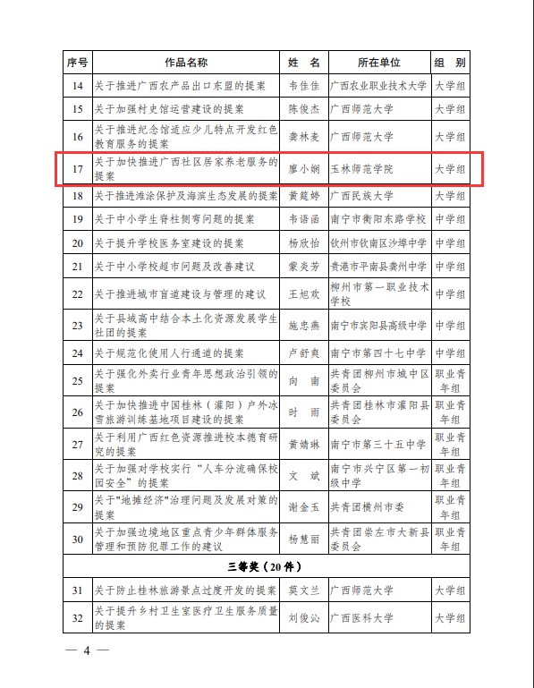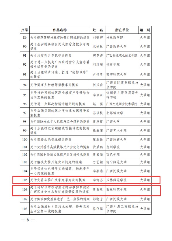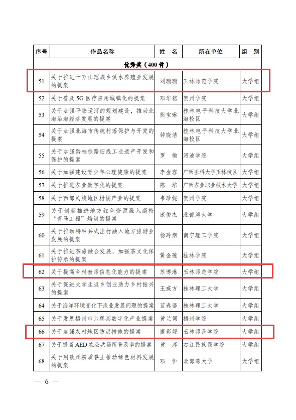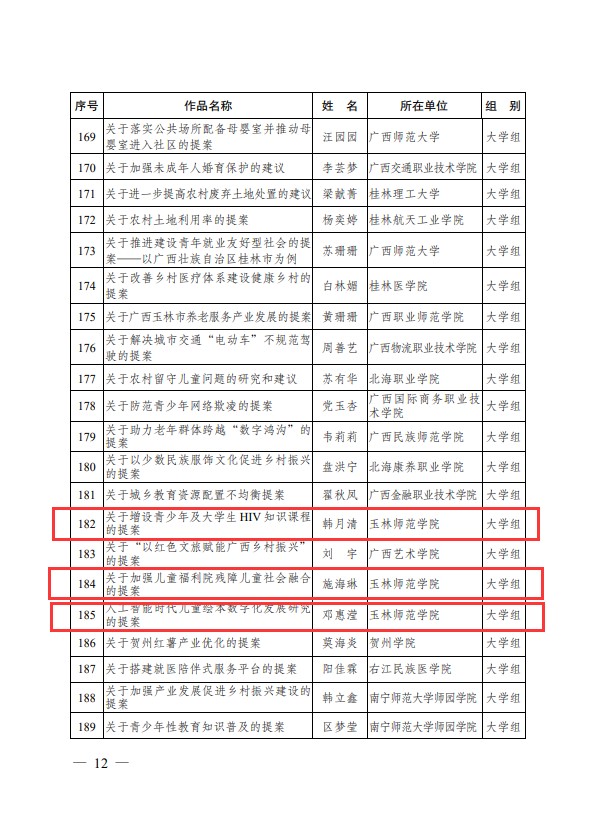 近日,共青团广西区委、自治区政协办公厅、自治区教育厅、广西学联联合开展的“2023年广西青少年模拟政协提案征集活动”获奖名单公布。我校入选自治区优秀模拟政协提案作品共计17份,其中化学与食品科学学院《关于助推预制菜产业高质量发展的提案》荣获大学组一等奖,政法学院《关于加快推进广西社区居家养老服务的提案》荣获大学组二等奖,外国语学院《关于广西科技馆建设发展的提案》荣获大学组三等奖,以及共有14个优秀提案荣获优秀奖。我校荣获“2023年广西青少年模拟政协提案征集活动优秀组织单位”。