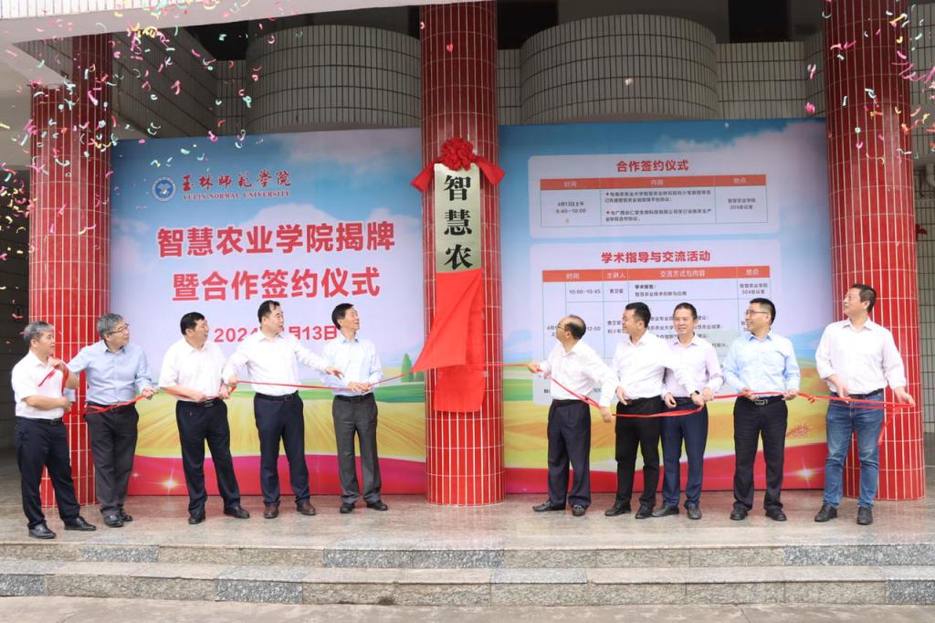 4月13日,完美在线登录官网于东校区举行智慧农业学院揭牌暨合作签约仪式。全国政协教科卫体委员会副主任、南京农业大学智慧农业研究院院长曹卫星,我校党委书记李清先、校长李伟中、副校长石维有,玉林市人大常委副主任黄雕、玉林市副市长党万坚、玉林市政协副主席徐建伟,国家信息农业工程技术中心副主任、南京农业大学智慧农业研究院副院长刘小军等领导和企业代表出席仪式,完美在线登录官网相关职能部门和二级学院负责人、师生代表参加仪式。