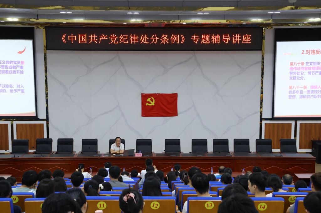为加强党性教育,提升师生纪律意识和规矩意识,5月16日下午,纪委书记李月发在新民楼D101报告厅为师生开展《中国共产党纪律处分条例》专题辅导讲座,数学与统计学院全体教工党员、学生党员以及入党积极分子,美术与设计学院、物理与电信工程学院第十六期入党积极分子参加学习。